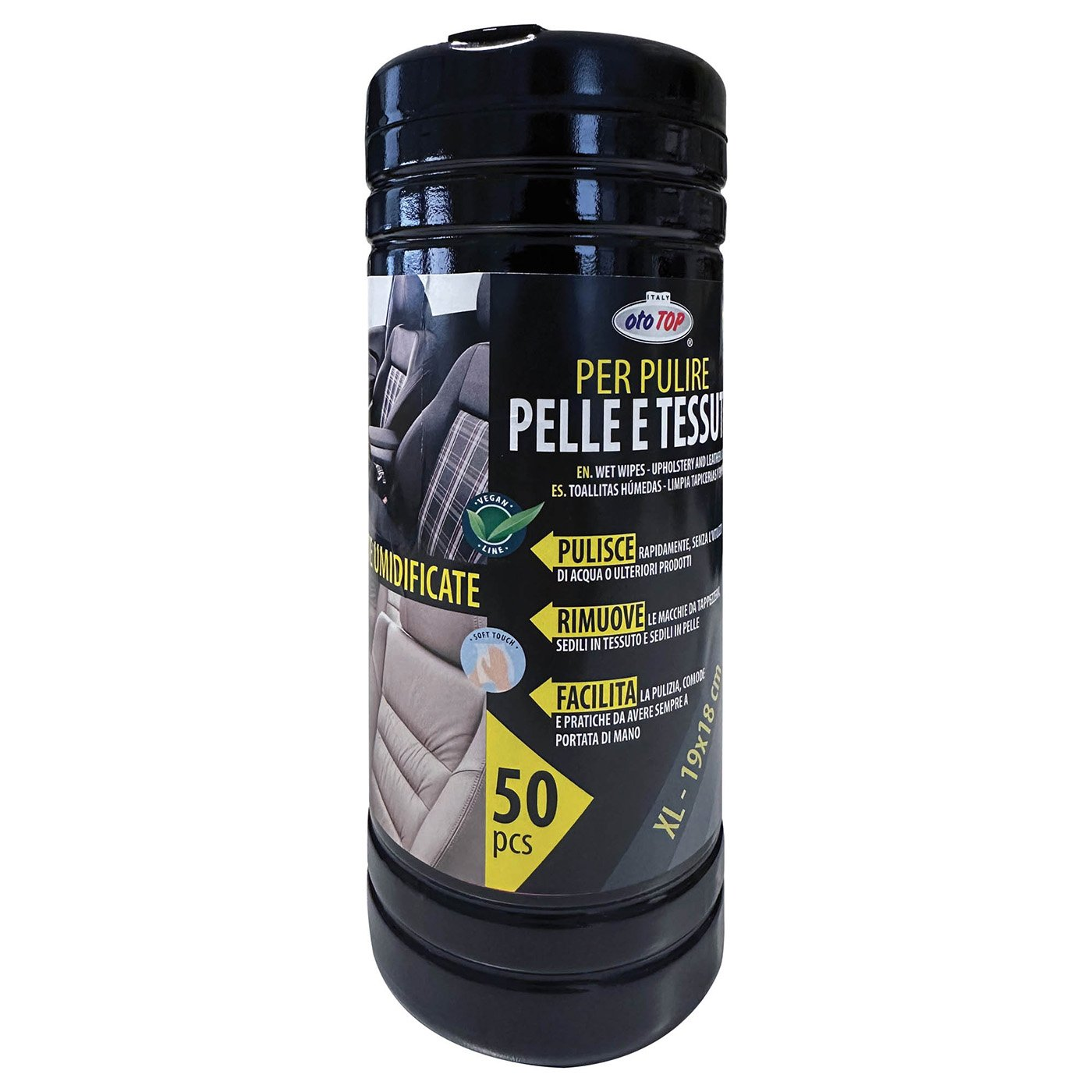 Nedves törlőkendő otoTOP bőr és textil felületre. Víz nélkül eltávolítja a gyakori foltokat, és felfrissítí az ülések, háttámlák és ajtópanelek kárpitját. XL 19x18 cm, 50 db visszazárható dobozban.