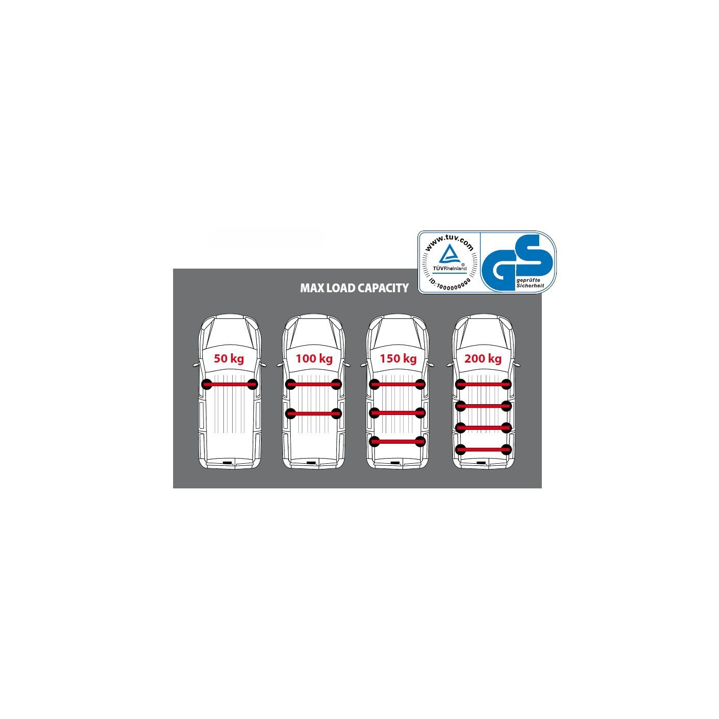 A tetőcsomagtartó egy talpszettből áll, amelyet egy adott autóhoz terveztek és mindig az autógyártó által meghatározott pontokra rögzítik. A csomagtartó terhelése rudanként 50kg. Ha 2 rúddal rendelkezik a tetőcsomagtartó teherbírása 100 kg / 3 rúd 150 kg / 4 rúd 200 kg.