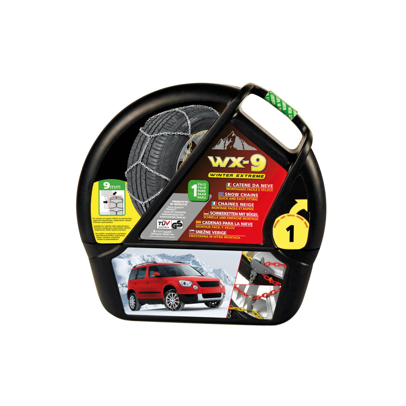 | Felirat | minőségi, nagy szilárdságú 9 mm-es hóláncok edzett acélból |